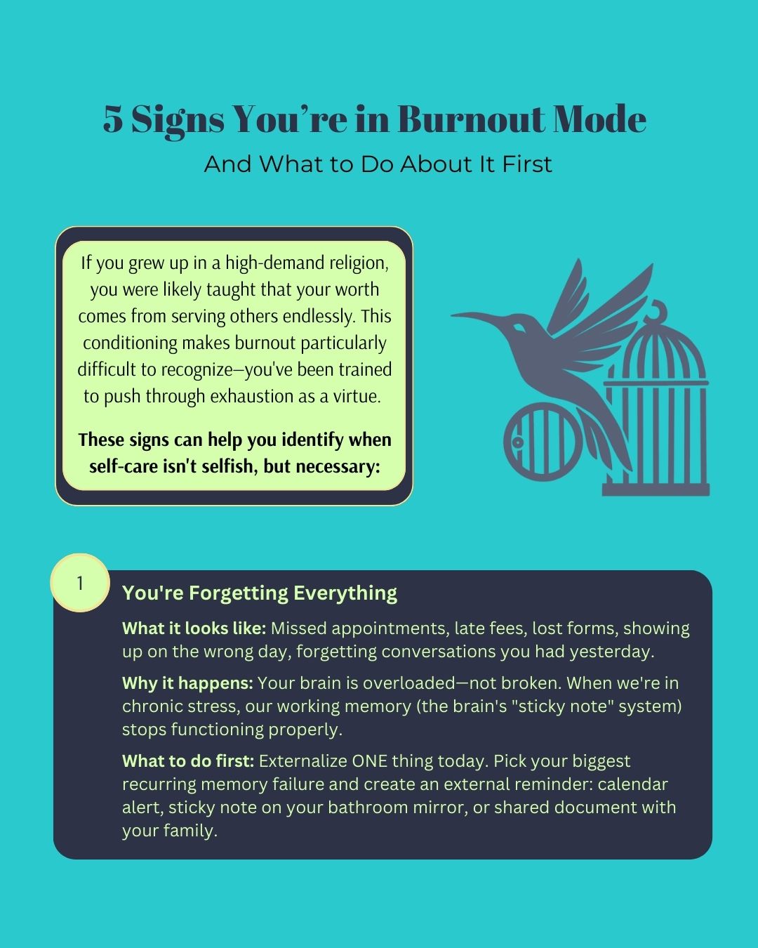 Burnout isn’t laziness—it’s survival mode. If you grew up in a high-demand religion, you were taught to push through exhaustion and call it virtue. 5 Signs You’re in Burnout Mode helps you recognize the hidden warning signs—like brain fog, resentment, and waking up exhausted—and gives you simple first steps to begin recovering your energy, clarity, and sense of self.
